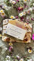 This wonderful soap is a recipe from a favorite soap maker Simi of Muddy Mint! It is a gorgeous bar with aloe vera juice and a glorious essential oil blend of lavender, geranium, cedarwood, grapefruit and clary sage! Colored with pink rose clay, Brazilian yellow clay, Brazilian purple clay and moringa leaf powder. Topped with rose, chamomile, cornflower and calendula petals. It is like walking through a sunny field of wildflowers. Wrapped in a seed embedded paper you can plant and grow your own wildflowers!